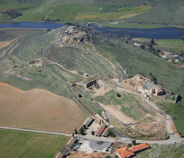 3. Vista aérea del yacimiento de Alarcos, sobre el montículo los restos del castillo cristiano, a la derecha la iglesia de la Virgen de Alarcos y abajo, el centro de interpretación