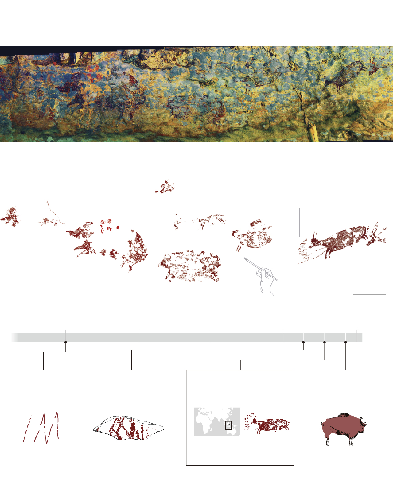 La composición incluye dos jabalíes y cuatro búfalos enanos en torno a los cuales pueden verse hasta ocho figuras mucho más pequeñas que parecen humanas. Algunos de ellos parecen acechar a sus presas con lanzas o cuerdas. La datación de los depósitos minerales acumulados sobre tres de las figuras de animales indica que se pintaron hace al menos 43.900 años. A juzgar por el color y su grado de desgaste los científicos piensan que todas las figuras se hicieron a la vez y por lo tanto componen la narración de una historia, la primera de la que hay constancia. El único autor posible de esta sorprendente obra es el Homo sapiens, nuestra propia especie, que llegó a estas islas del sudeste asiático hace entre 40.000 y 50.000 años.